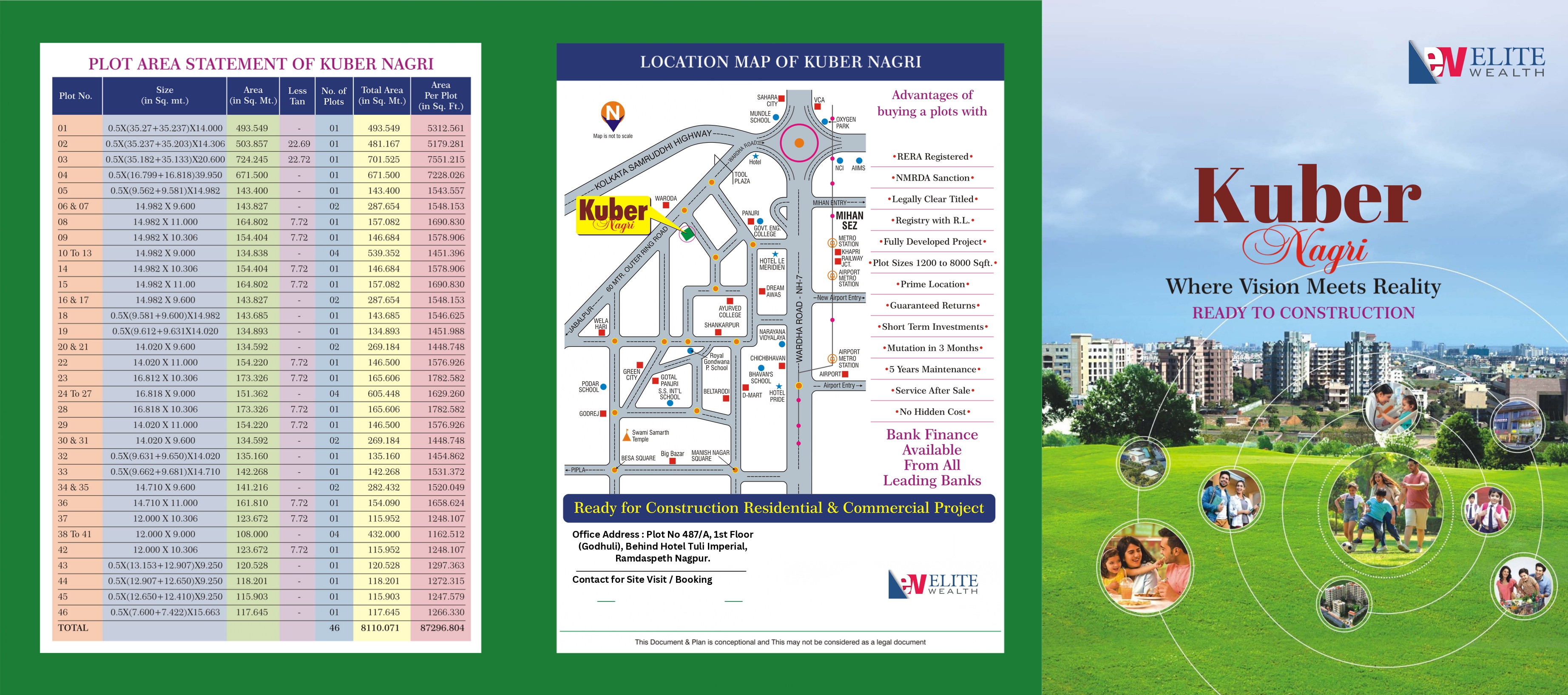 Kuber Nagari An Exclusive Community of 46 Premium Plots Across 2 Acres of Prime Land ✨ Secure your future with a plot in one of the most promising locations. Nestled in a peaceful yet well-connected area, Kuber Nagari offers a rare opportunity to build your dream home or make a smart investment. Exclusive Amenities: πŸ“ Precisely Demarcated Individual Plots πŸ›£οΈ Internal Cement Roads πŸ’‘ Electrification with Street Lights 🚰 Water Pipeline Network 🌧️ Storm Water Drainage System ♻️ Sewage Network System & STP 🧱 All Around Compound Wall for Open Space πŸ” Fenced Compound Boundary 🌳 Landscaped Garden 🧸 Children Park 🌿 Avenue Plantation πŸ“ Site Address Residential Layout Plan on Kh. No. 30/B(Part), P.H. No. 41, Mouza : Waroda, Tah.& Dist. : Nagpur.